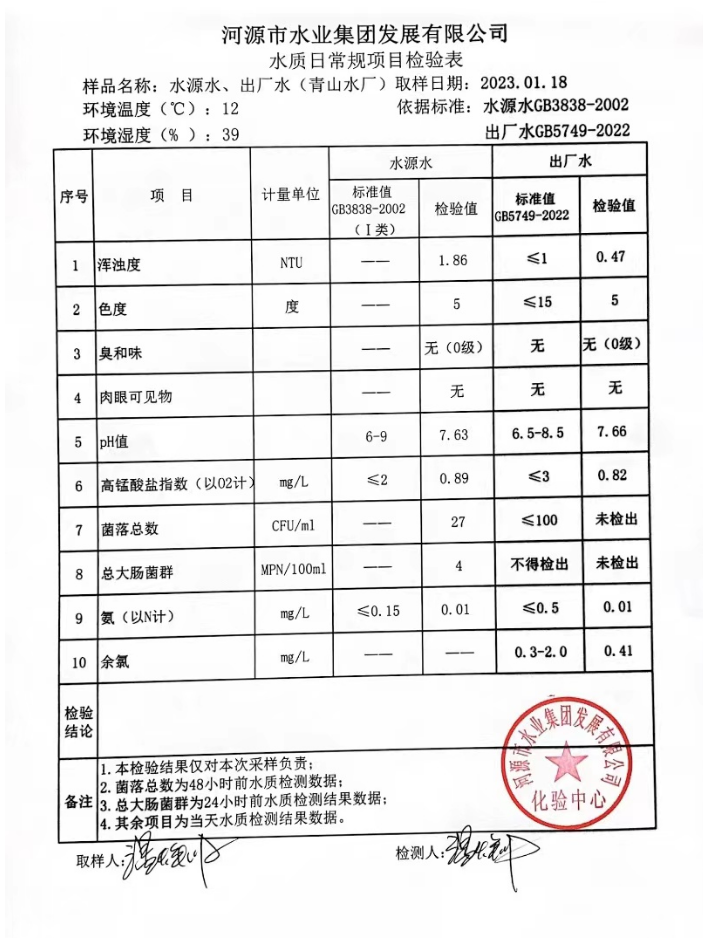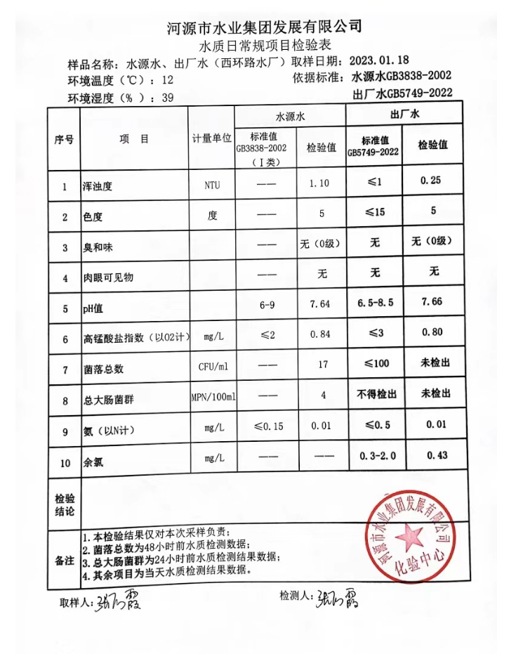 2023年1月18日水質(zhì)檢驗報告