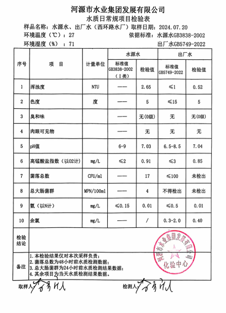 2024年7月20日水質(zhì)檢驗報告